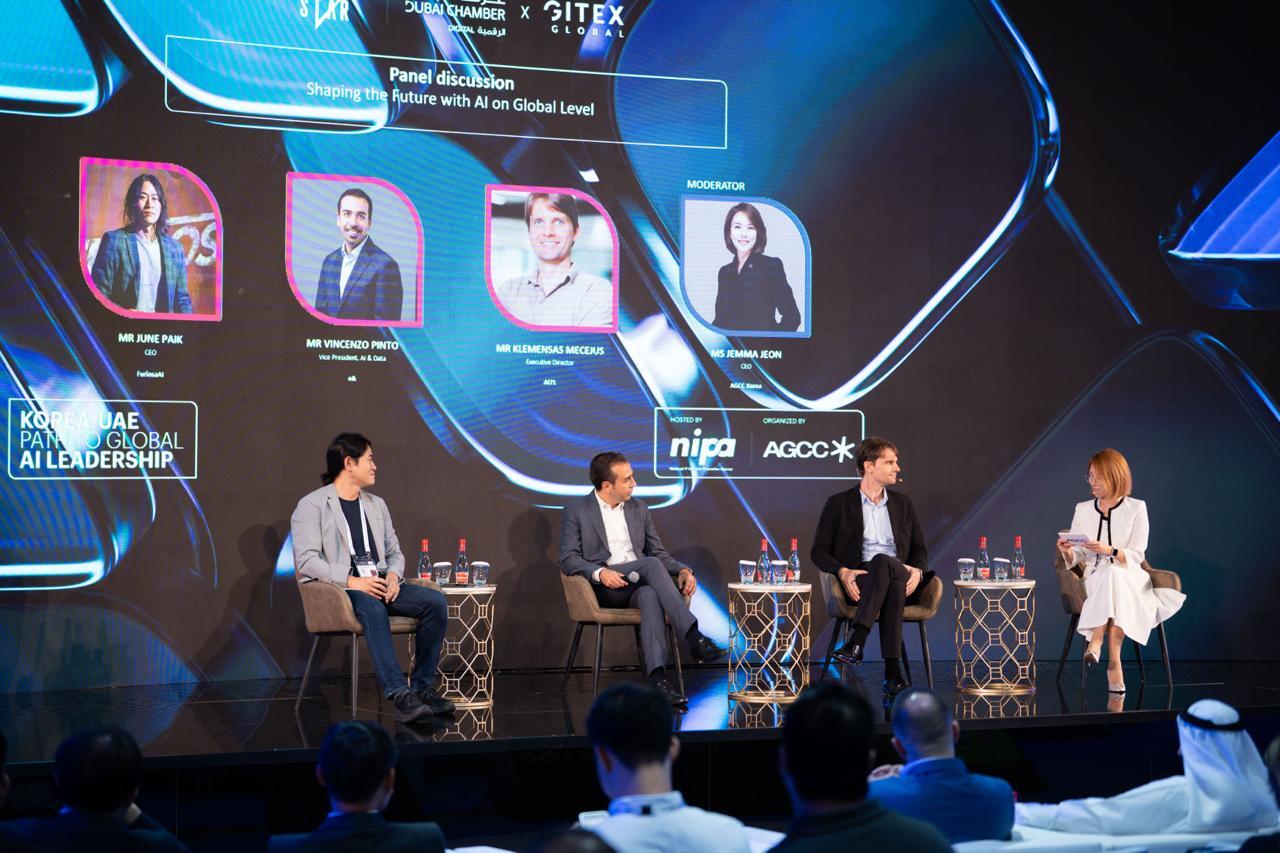 The first panel session, “Shaping the Future with AI on Global Level”, moderated by Jemma Jeon, CEO of AGCC Korea (the organizer of the event), featured an elite panel of global AI infrastructure and application layer experts Vincenzo Pinto, Vice President, AI & Data at e&; Klemensas Mecejus, Executive Director at AI71; June Paik, CEO of FuriosaAI.